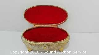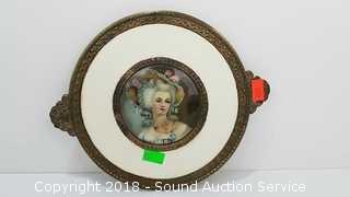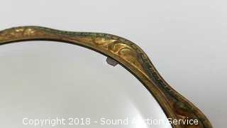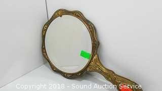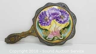 Mirror looks to be molded out of brass with hand painted floral back & beveled glass. Small piece of the mirror is missing. Approx. 5" diameter mirror, 10" L.