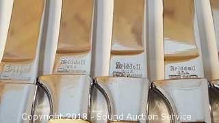 Includes: 8 Briddell Steak Knives, 2 Bamboo Cutting Boards 14" x 10" and 11" x 18", Fiddle Bow Knife and Unique Wooden Cutting Board.