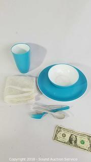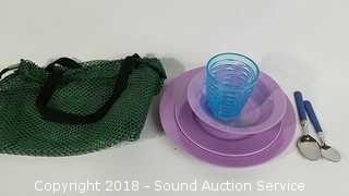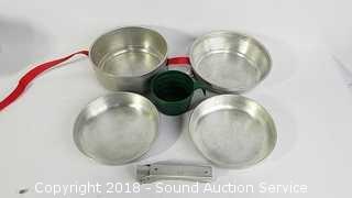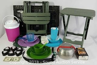 Includes: Aluminum Backpacker Pot & Pan Set, 3 Plastic Place Settings, Drink Cooler, and 2 Folding Tables.