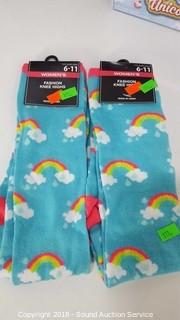 Includes: 2 Pairs of Women's Knee High Rainbow Socks 6-11, Unicorn Tape Dispenser, Unicorn Discovery Kit, Unicorn Decision Maker Pen, Canvas & Painting Set, and Fruitominos.