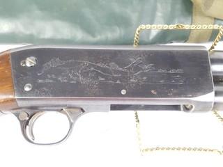Serial 1849982. 2-3/4" chamber, 28" long barrel, 47" long overall. Engraved with ducks. Comes with vinyl soft case. A few minor scuffs in the wood. In overall good condition. Made in New York. Preview of these items by appointment only. In accordance with U.S. law, this lot must either be picked up at Reaper Industries in Olympia, Washington or shipped to a U.S. licensed firearms dealer (FFL) of the buyer's designation. Handguns will be shipped via USPS Priority Mail; shotguns & rifles will be shipped according to Reaper Industries standards and in accordance with U.S. laws. All shipping and handling charges will be paid by the buyer and billed by Reaper Industries. All transfer fees will be paid by the buyer at Reaper Industries at the price of $30 per item.