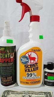 Includes: Scent Killer 99% Effective, Scent Zapper Real Dirt Formula, and Black Tail Buck Urine.