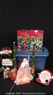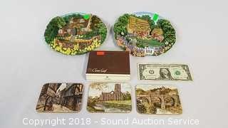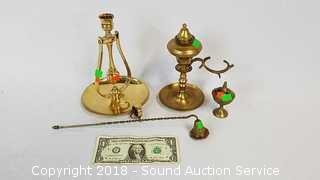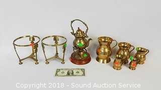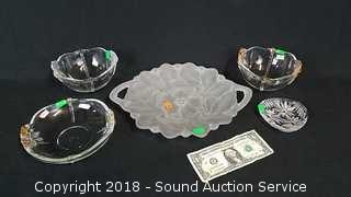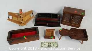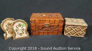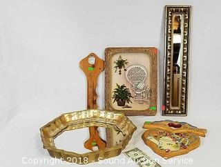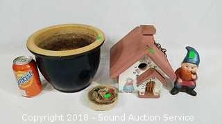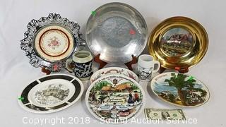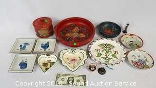 Includes: Rustic Gardeners Tool w/Pocket Sheath, Floral Print Fine Porcelain Trinket Dishes & Vases, Brass Handheld Candlestick Holder & Oil Lamp, Art Pottery Vase, Canister & Salt Shaker, Wooden Sugar Dish, Honey Pot, Incense Holder &More, Various Solid Brass Dishes & Decor, Various Collectible Foreign Mugs & Plates, Various Hand Painted Wooden Bowls & Dishes, Large Aluminum & Silverplate Chargers & Tray, Handmade Lattice Dish & Trinket Dish, Tia Maria Schmidt Brazil Demitasse Cups & Saucers, Various Latch Hook Yarn & Snow Cover Blankets, Pottery Planter, Birdhouse, Gnome & Squirrel Decor, Tote Loaded w/Christmas Ornaments & Avon Dishes, Tote w/Christmas String Lights, Topper & Decor, Carved Wooden Chest, Trinket Box & Bookends, Franklin Mint High Relief Cottage Decor & Coasters, Pair of Occupied Japan Tea Cups, Various Wooden Jewelry Boxes & Decor, Mirrors & Wall Home Decor, Various Collectors Spoons & Tin Tray, 5pc. Crystal Bowls, Ashtray & Frosted Plate, Lovely Cut Crystal Pitcher & Trinket Dish, 1950 Walt Disney's