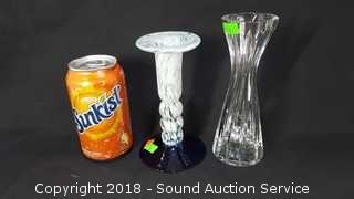 One of the bobeches is cracked. Do not see any chips or cracks in the candlestick holders. Approx. 7" to 8" H.