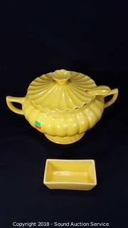 Also comes with butter dish and ladle. Ladle and lid have a small chip. Approx. 9" H, 10" diameter.