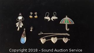 Includes: Nice Fire Opal & Silver Pendant, Mexican Umbrella Pendant, Baltic Amber & Silver Earrings, Stud, Necklace Chain Part, and Hand Crafted Earrings. Total weight: 17 grams. ATTN: We are not jewelry experts or appraisers, please use your own judgement when bidding.