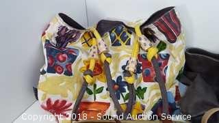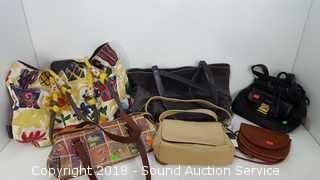All but one are leather. Includes: Sun & Sand Canvas Bag, Coach Grey Leather Handbag #950-1714, Liz Claiborne Purse (Original tag of $108), Perlina Leather Handbag, Liz Claiborne Crossbody Bag, Fossil Purse.