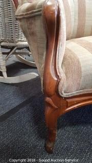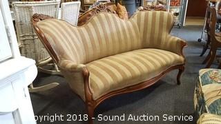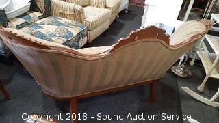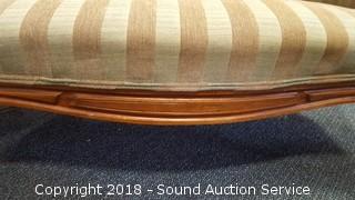 Striped fabric, ornately carved wooden accents. Approx. 5ft L, 32" H.
