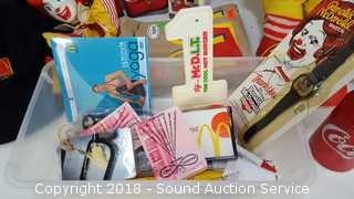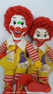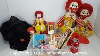Includes: (2) 1978 Vtg. 19" Ronald McDonald Dolls, 1984 12" Ronald McDonald Doll, 1993 Hand Puppet, McDonalds Athletic Bag, Hat, Lunch Bag, Watch, Ice Scraper, Keychain, Toothbrush, Pins and more.