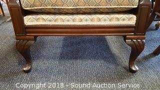 Believe it to be solid mahogany frame. Comes with lumbar support throw pillow. Approx. 22" wide seat, 29" wide overall, 34" H, 29" D.