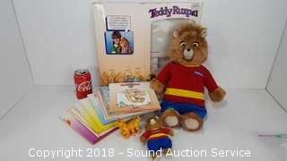 Also comes with 8 Teddy Ruxpin storybooks. Has the original box. Approx. 16" H.