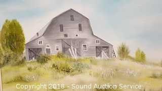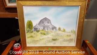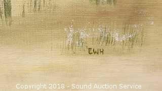 In gold painted barn wood frame. Dated 1986. Initialed "E.W.H.". Overall approx. 23-1/2" x 19-1/2". Frame fits a 20" x 16" piece of artwork.