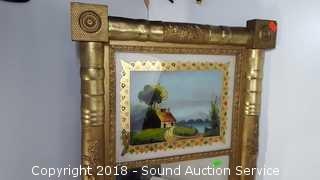 Hand painted on glass cottage on the lake scenery mirror. Some discoloration to the mirror. Approx. 31" x 16". Art is by Tosa Mitsuoki 1617-1691 Titled: Quails & Flowers, Museum of Asiatic Art Amsterdam approx. 17" square.