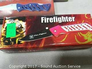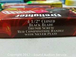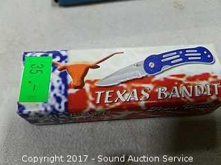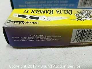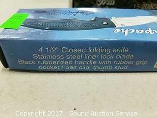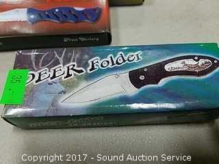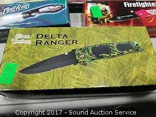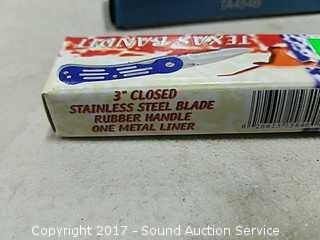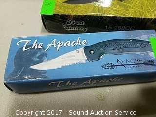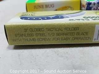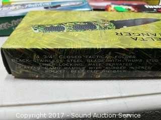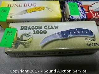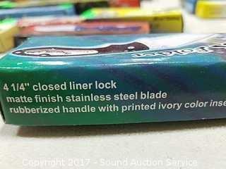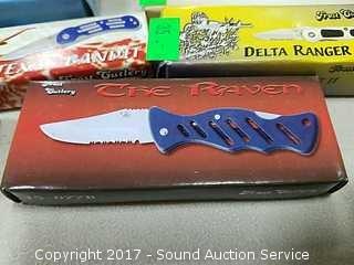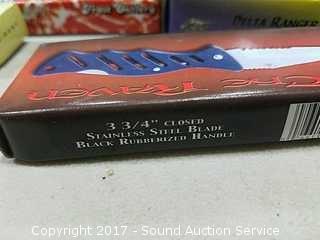 Includes The Apache 4-1/2" Knife with Clip, Delta Ranger 4 3/4" Closed Tactical Folder, Office Pen Folding Knife, June Bug Key Chain Knife, Texas Bandit 3" knife, Delta Range II 4 1/4" Knife W/ Belt Clip, Dragon Claw 2000 3" Serrated Blade Knife, Firefighter 4 1/2" Black Blade Knife W/ Red Handle, Deer Folder 4 1/4" Steel Blade W/ Rubber Handle