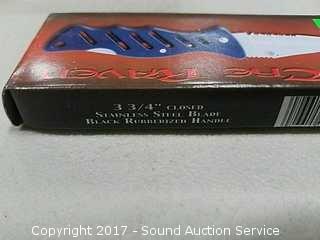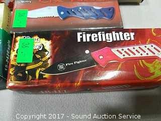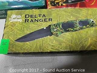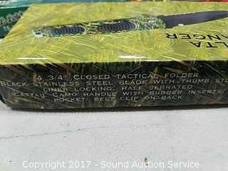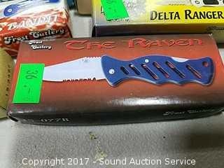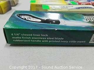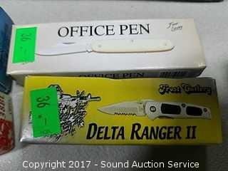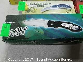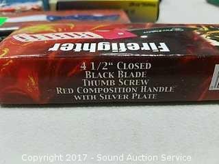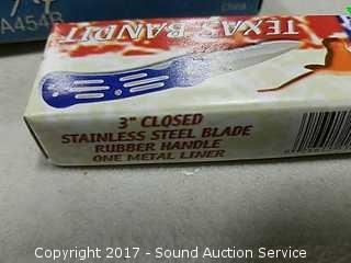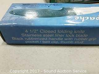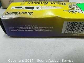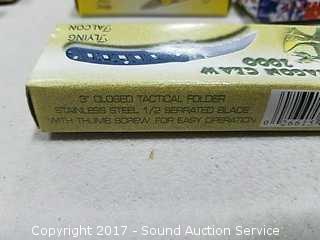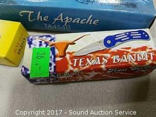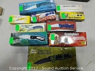 Includes The Apache 4-1/2" Knife with Clip, Delta Ranger 4 3/4" Closed Tactical Folder, Office Pen Folding Knife, June Bug Key Chain Knife, Texas Bandit 3" knife, Delta Range II 4 1/4" Knife W/ Belt Clip, Dragon Claw 2000 3" Serrated Blade Knife, Firefighter 4 1/2" Black Blade Knife W/ Red Handle, Eagle Folder 4 1/4" Steel Blade W/ Rubber Handle