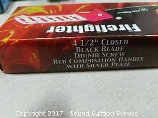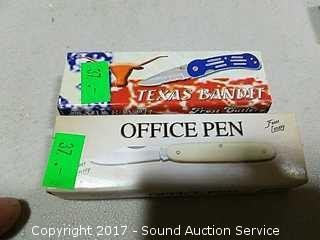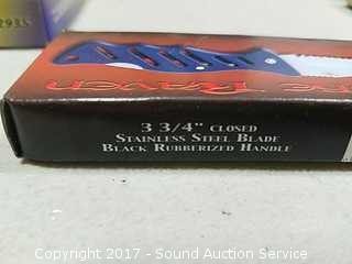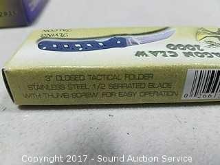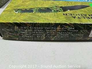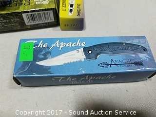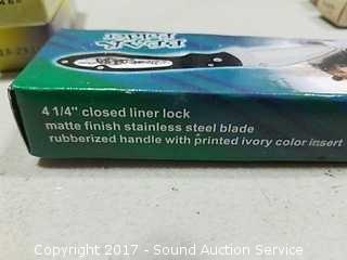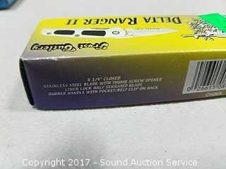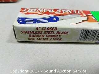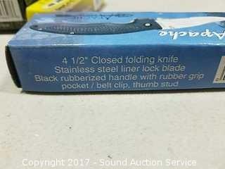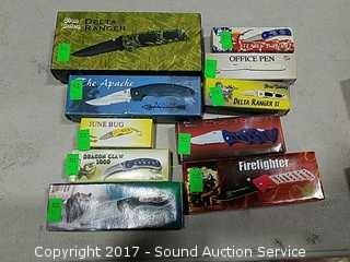Includes The Apache 4-1/2" Knife with Clip, Delta Ranger 4 3/4" Closed Tactical Folder, Office Pen Folding Knife, June Bug Key Chain Knife, Texas Bandit 3" knife, Delta Range II 4 1/4" Knife W/ Belt Clip, Dragon Claw 2000 3" Serrated Blade Knife, Firefighter 4 1/2" Black Blade Knife W/ Red Handle, Bear Folder 4 1/4" Steel Blade W/ Rubber Handle