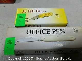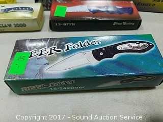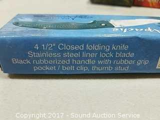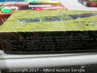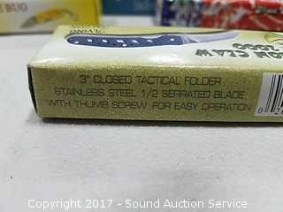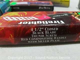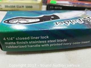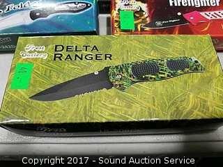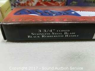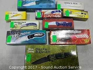 Includes The Apache 4-1/2" Knife with Clip, Delta Ranger 4 3/4" Closed Tactical Folder, Office Pen Folding Knife, June Bug Key Chain Knife, Texas Bandit 3" knife, Delta Range II 4 1/4" Knife W/ Belt Clip, Dragon Claw 2000 3" Serrated Blade Knife, Firefighter 4 1/2" Black Blade Knife W/ Red Handle, Deer Folder 4 1/4" Steel Blade W/ Rubber Handle