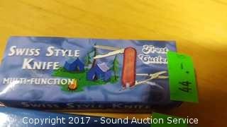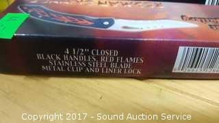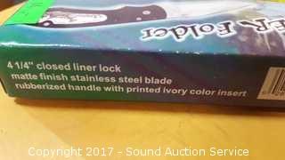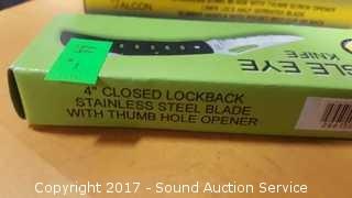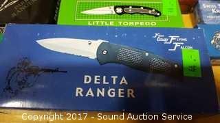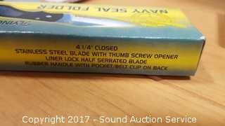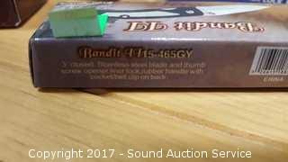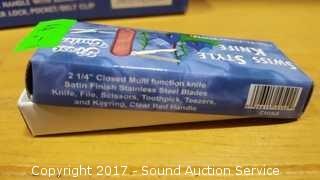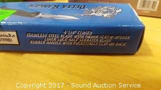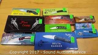 Includes: Bandit 3" Key Chain Knife W/ Belt Clip, Delta Ranger 4" Knife, Eagle Eye 4" Lock Back Knife, Navy Seal Folder 4 1/4" W/ Belt Clip, Red Man Skinner 4 1/2" Knife W/ Belt Clip, Park Ranger II Folding Knife W/ Sheath, Little Torpedo Folding Knife W/ Belt Clip, Liner Lock Knife W/ Belt Clip, Delta Ranger 4 3/4" W/ Liner Lock & Belt Clip, 2 1/4" Swiss Style Key Ring Knife, Deer Folder 4 1/4" Liner Lock Knife.