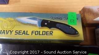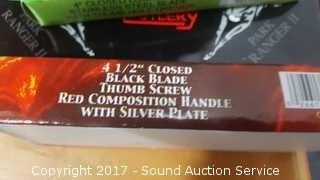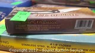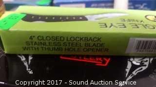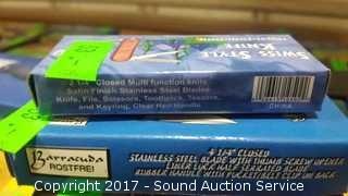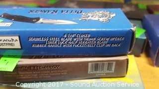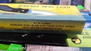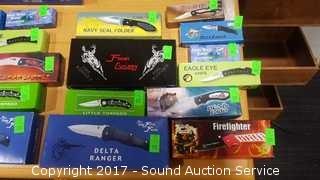 Includes: Bandit 3" Key Chain Knife W/ Belt Clip, Delta Ranger 4" Knife, Eagle Eye 4" Lock Back Knife, Navy Seal Folder 4 1/4" W/ Belt Clip, Firefighter 4 1/2" Closed Linerlock Knife, Park Ranger II Folding Knife W/ Sheath, Little Torpedo Folding KNife W/ Belt Clip, Liner Lock Knife W/ Belt Clip, Delta Ranger 4 3/4" W/ Liner Lock & Belt Clip, 2 1/4" Swiss Style Key Ring Knife, Bear Folder 4 1/4" Liner Lock Knife.