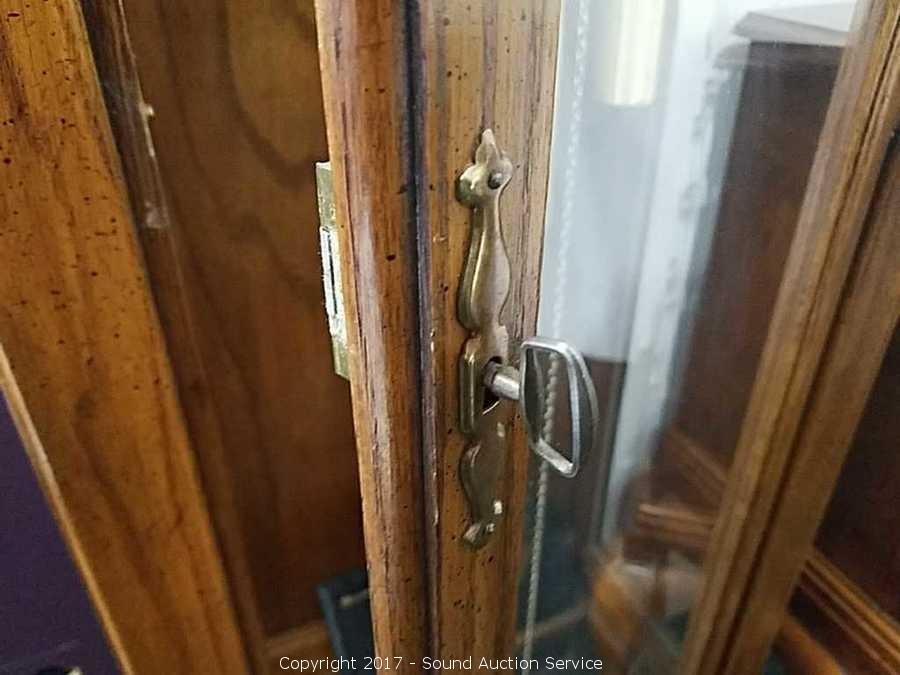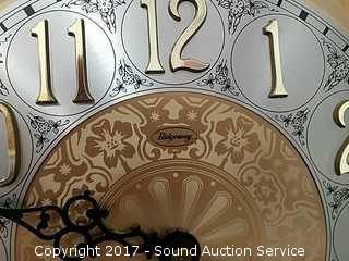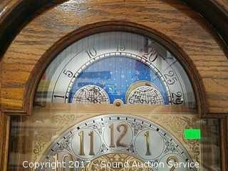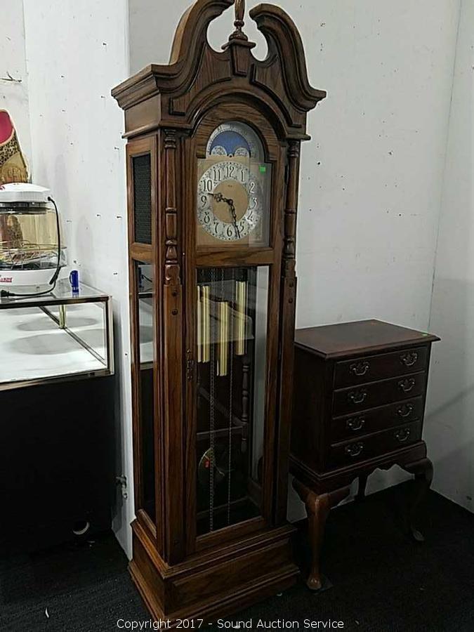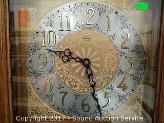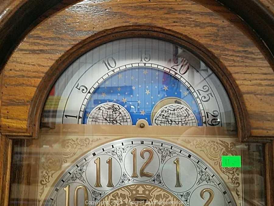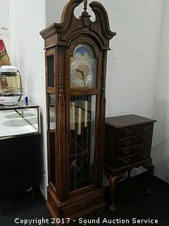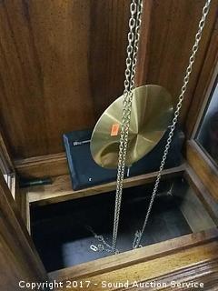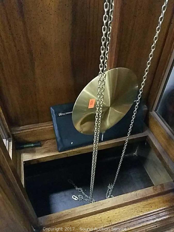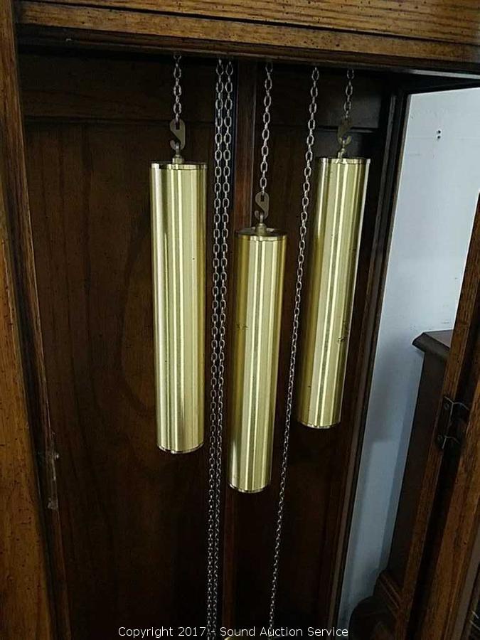 There is a little forked wire thingy that is part of the attachment of the pendulum to the mechanism. That little fork/wire has 2 sides. As it currently sits, one side is broken. It has been working fine for years that way, pendulum hangs a little crooked looking, but works fine as long as it's leveled front to back and side to side, dead on the bubble. In the black zipper bag in the bottom of the clock are the original papers and one more of those little 2 sided wire thingys. I've been guarding it like crown jewels because I have no idea if it would be possible to get another one. Whoever buys this should be careful with that little forked 2 sided piece. Benjamin & Sons on Martin Way may be able to help, if needed. Approx. 82" tall, 23" wide and 14" deep.