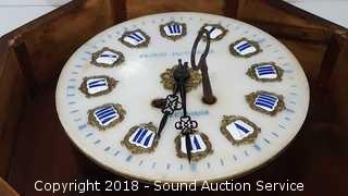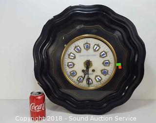 Face is hand painted. Wound tight, needs serviced. Has some damage on the edge. Approx. 19" diameter, 5" D.