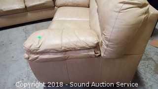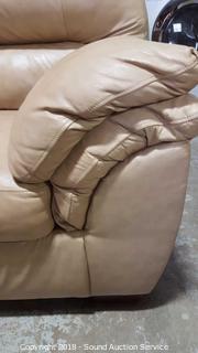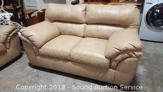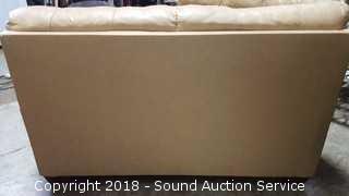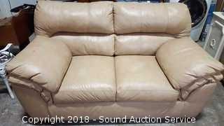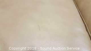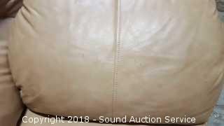 Very comfortable. Outer cover: 45% leather, 55% polyurethane. Approx. 65" L, 37" H, 37" D.