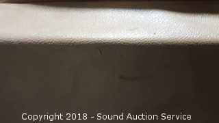 Very comfortable. Outer cover: 45% leather, 55% polyurethane. Has some scuffs and fading on the top. Approx. 87" L, 37" H, 37" D.