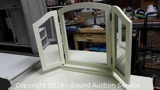 5 drawers. Approx. 30" H, 43" W, 19" D. Tri-fold mirror is 23" x 18" with (2) 9" panels.