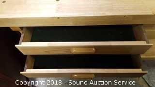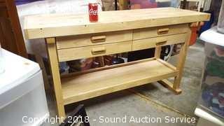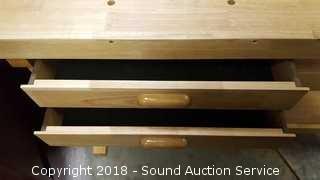Has 4 felt lined drawers with ball bearing drawer guides, work well. Very sturdy, lower shelf, and nice 12" wood block vice. Approx. 34" H, 62" L, 20" W.