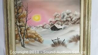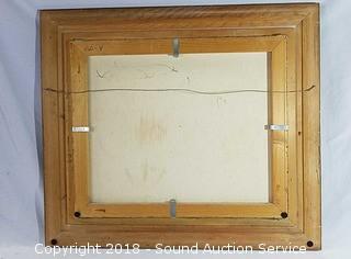 In a nice wooden frame. Frame fits a 24" x 20" piece of artwork. Overall approx. 27" x 31".