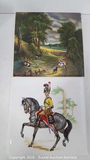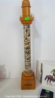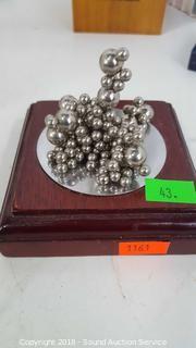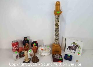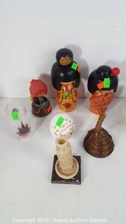 Includes: Magnetic Sculpture, 8 Painted Tiles, 3 Wooden Dolls (2 Chinese, 1 Russian), USS Newport Medallion, Ceramic Egg, Shot Glass, and Vtg. Dish Full of Buttons.