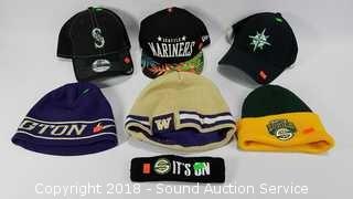 3 Ballcaps, 3 Beanies. Mariners, Sonics & Huskies. Small to medium.