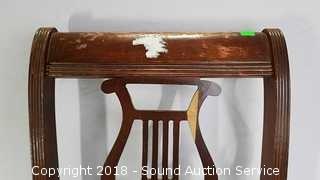 Piece of the finish is chipped off the Lyre Back. Approx. 32" H x 17" W, 18" D.