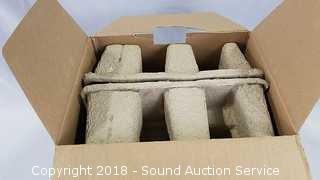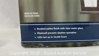 Brushed patina finish with clear water glass, photo cell. Comes in original box. 11.3" H, 8.4" x 6.5".