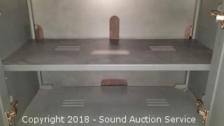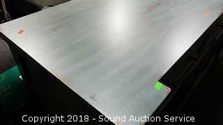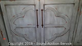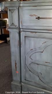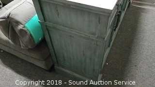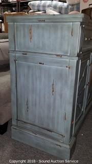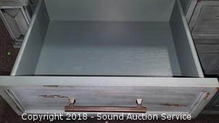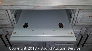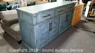 Like new condition. Has 3 drawers with ball bearing drawer guides, 2 lower cabinets, front folds down on middle drawer, cord holes in the back. Has a nice distressed teal finish. Approx. 36" H, 70" W, 19-1/2" D.