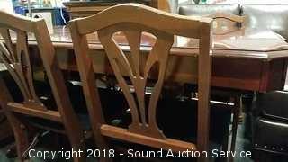 Comes with 4 Leaves and 6 fodling chairs. Approx. 30" H x 43" W x 65" L, with (4) 11-1/2" wide leaves. Nice finish needs a good polishing. Chairs are not the original chairs to the table but look good with it.