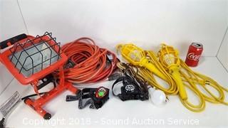 All work. Includes: Halogen Shop Light-needs bulb, (2) 25ft Extension Cords, Pair of Drop Lights, 2 Headlamps, and Clip On Light.