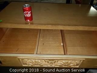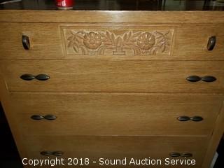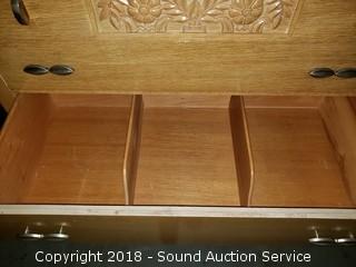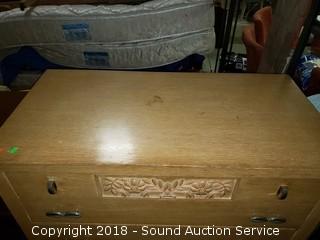 Chrome hardware, decorative motif on the front. Approx. 45-1/2" H, 39-1/2" W, 20" D.