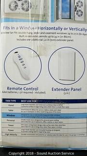 Fits horizontally or vertically, reversible blades, 3 speed settings, adjustable extender panel, remote control. Fits windows 24" to 27", up to 34" with extender. Comes in original box.