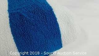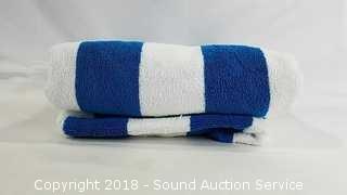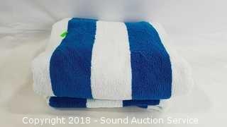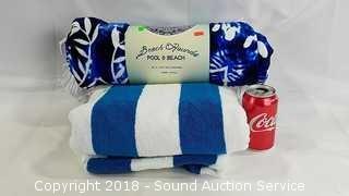 Round beach towel is in original packaging, 100% cotton. Resort towel is reversible, by Charisma, 100% cotton, 32" x 64".
