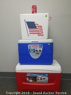Includes: Igloo 48QT Cooler, Coleman 28QT Cooler, and Styrofoam Cooler. Largest is 14-1/2" H, 24" L, 14" W.