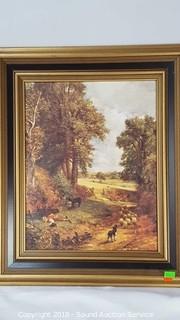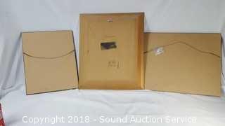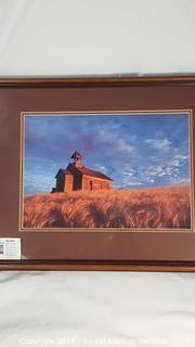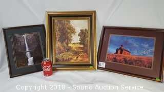 Print is of child and farm animals, frame fits an 11" x 14" piece of artwork, solid wood. 2 are framed and matted with glass photos, frames fit 11" x 14" artwork. One is a framed and matted with glass school house photo, frame fits 13" x 16" piece of artwork.
