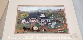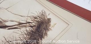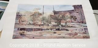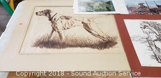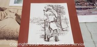 Some are signed and numbered. Includes: T.A. Gaussiran Mountain Man Print 71/250, Cindy Mangutz Country Market Print 13/1500, Dick Julian Suiter's Lady Deluxe Pacific Coast Champion Original Drawing, and various others. Please refer to photos for more information. Largest is approx. 26" x 31". Folder holds 16" x 22" artwork.