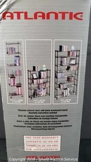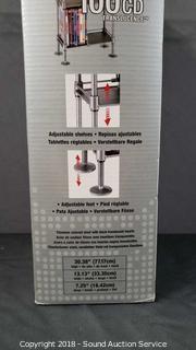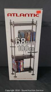 Holds 68 DVDs or 100 CDs, adjustable shelves. 30" H, 13" W, 7" D. Comes in original box.
