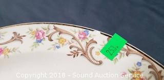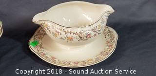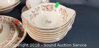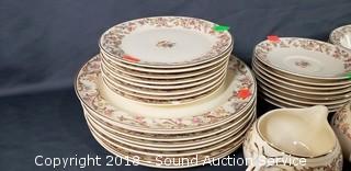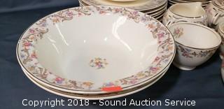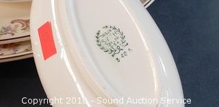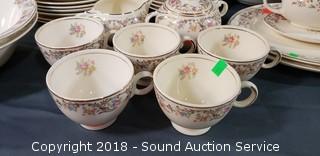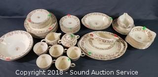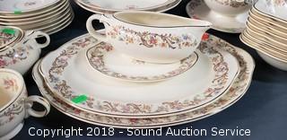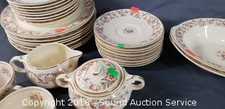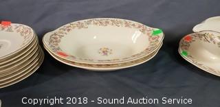 Includes: (8) 9-1/4" Dinner Plates, (8) 6-1/2" Dessert Plates, (8) 6" Soup Bowls, 8 Saucers, 5 Teacups, 11-1/2" and 13" Platters, 2 Gravy Boats, Cream, Sugar, (2) 9" Oval Serving Bowls, and (2) 9" Round Serving Bowls. One of the plates, one of the soup bowls, and 2 of the saucers have chips.