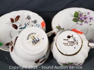 Includes: Matching Bell Cream and Sugar, Old Foley Teacup and Saucer, Beautiful Rose Console Bowl, Royal London Teacup and Saucer, Regency Teacup and Saucer, Rosina Teacup and Saucer, and Rosina Teacup.