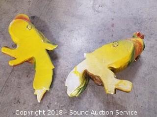One is missing a piece of his tail feather. Approx. 10" H.