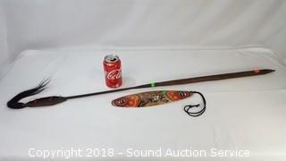 Comes with hand painted tribal plaque. Spear head is hand forged steel with wooden handle, beaded leather cover with horse hear. Overall approx. 39" L and 12" L plaque.