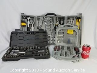 All come in cases. Socket set is mostly complete, missing one of the ratchets. Bit set is complete, comes with hand ratcheting driver. Tool set is mostly complete, missing a couple wrenches.