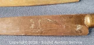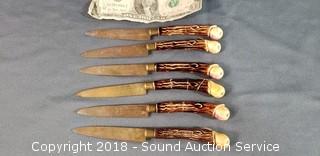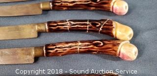 3 of the knife handles have cracks and have been repaired. Blades look to be either copper or brass. Knives are 6-3/4" long, 3-1/4" long blades. Overall approx. 3-3/4" x 3-1/2" diameter.